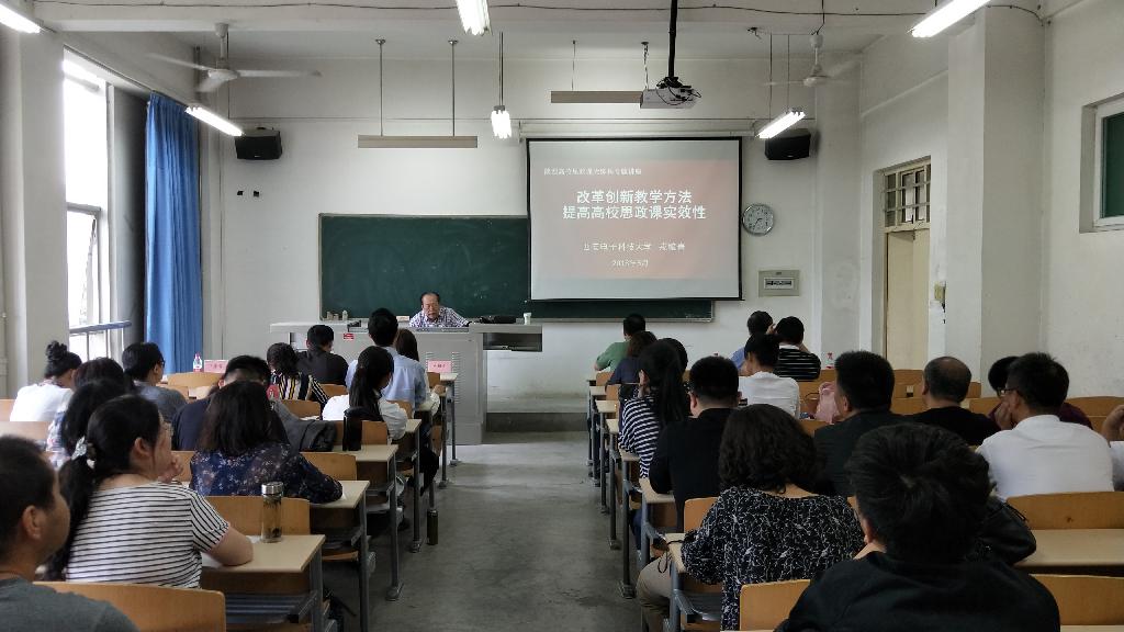 活动第一阶段由戎毓春教授做题为“改革创新教学方法提高高校思政课实效性”的报告,对学院教师进行全员培训。戎教授以问题为导向,以自己多年体会为例,从高校思政课教学的共性问题、从事思政教学的主要体会、着力提高思政课的实效性、改革创新思政课教学方法等四个方面阐述了提升教学质量的有效方法,整个报告站位高,内容丰富,感染力强,对提高教师教学能力具有很强的指导性和针对性。培训中多次响起热烈掌声,气氛十分热烈。