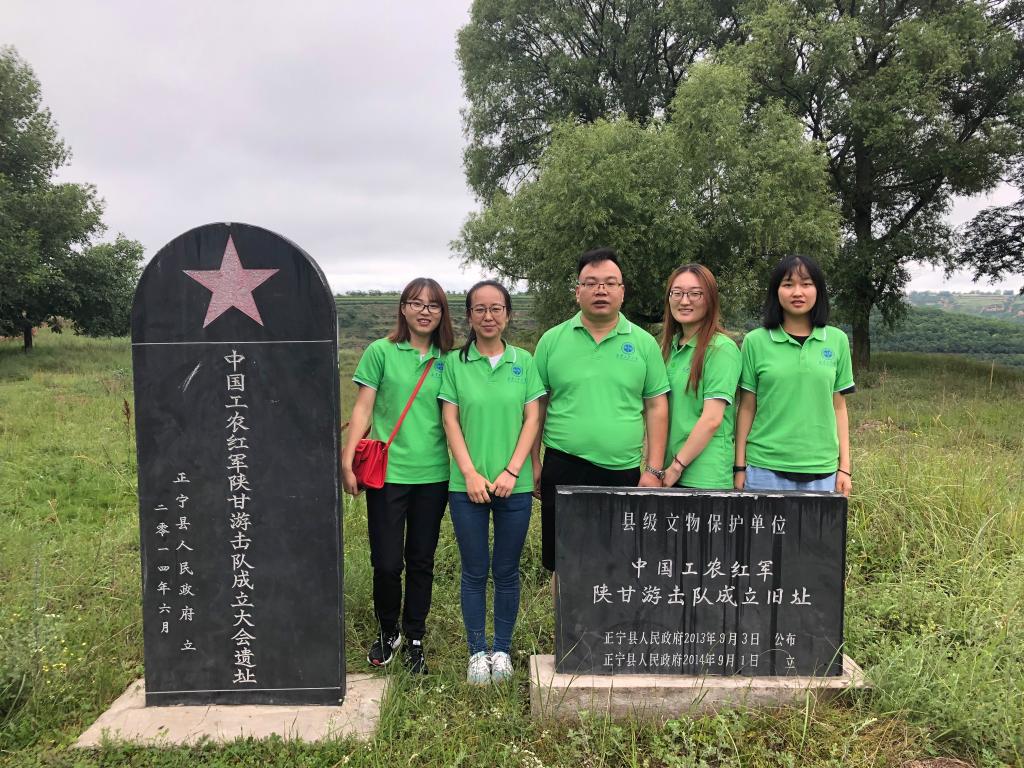 所有实践队员来到中国工农红军陕甘游击队成立遗址碑前抚碑追忆。1932年1月,陕西省委派军委书记李杰夫到达三嘉原锦掌村,对原西北反帝同盟军进行整编。2月12日在锦掌村西的大麦场上宣告成立中国工农红军陕甘游击队。工农红军陕甘游击队的成立,标志着我党第一支西北工农武装力量正式成立。从此,他们高举武装斗争的旗帜,开始建立陕甘苏区的艰苦探索。