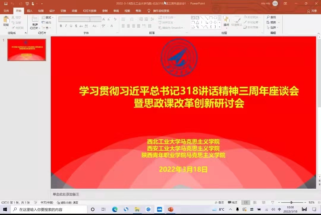 专家和教师参加这次盛会。西工大丁社教教授、高旭红教授,我校马院院长助理孟文科副教授、德法教研部主任冯婷副教授,陕西青年职业学院马院马雅玲院长等,从不同方面介绍了本校在3.18讲话精神指引下,对思政课程改革与创新的思路与成果。与会专家和教师给予充分肯定,并进行了深入研讨交流。