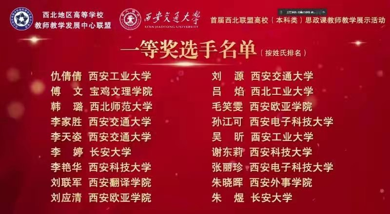 、全国高校思政课“手拉手”集体备课中心(西安交通大学)、超星集团等单位主办。来自西北五省(区)43所高校的202名教师,经过5个多月的充分准备和激烈角逐,经网络初评与决赛展示环节,共评出一等奖18项,二等奖33项。