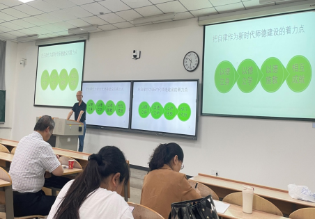 接着,开展师德建设专题学习。杨灏从何为“师德”引入,就十八大以来,习近平总书记对广大教师提出“四有好老师”“四个引路人”“四个相统一”等明确要求,强调评价教师队伍素质的第一标准应该是师德师风,思政课教师应发挥马克思主义理论学科的学科优势,挖掘红色历史文化资源,走出课堂,发出正能量声音,树立好老师形象。会上还学习了教育部公开曝光违反教师职业行为十项准则的典型案例。