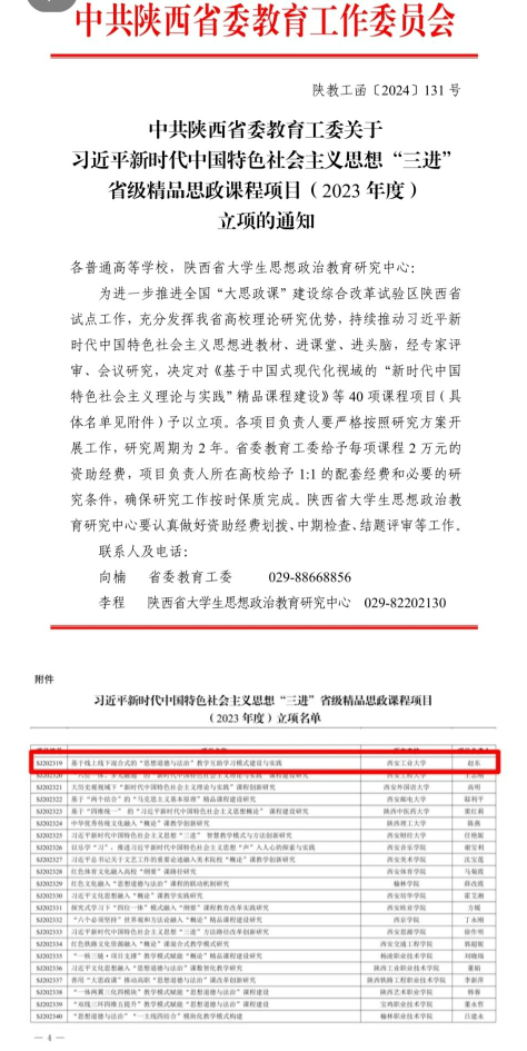 近日,中共陕西省委教育工委正式公布了2023年度陕西省习近平新时代中国特色社会主义思想“三进”省级精品思政课程项目评审结果,学院赵东副教授申报的“基于线上线下混合式的思想道德与法治教学互助学习模式建设与实践”获批为2023年省级精品思政课程立项。这是学院继《马克思主义基本原理》、《中国近现代史纲要》之后再次获批的一项习近平新时代中国特色社会主义思想“三进”省级精品思政课。