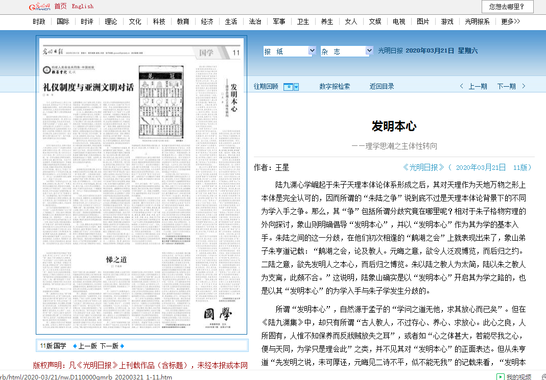 成人游戏 教师王星在《光明日报》发表文章《发明本心——理学思潮之主体性转向》