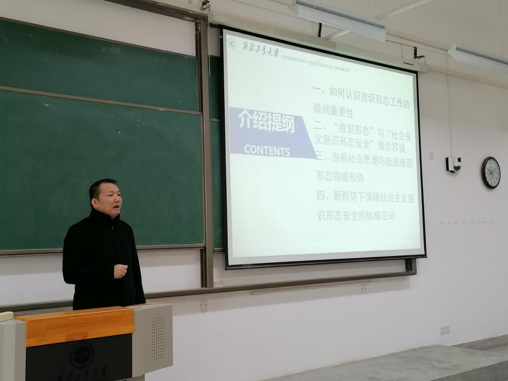 1118日,成人游戏 邀请西北工业大学郝保权教授,在教3-217作题为“当代中国社会主义意识形态安全研究”的学术讲座,此次为成人游戏 “精彩学术观”第十一讲。讲座由科研院长梁华平主持,学院全体师生参加了此次学术活动。