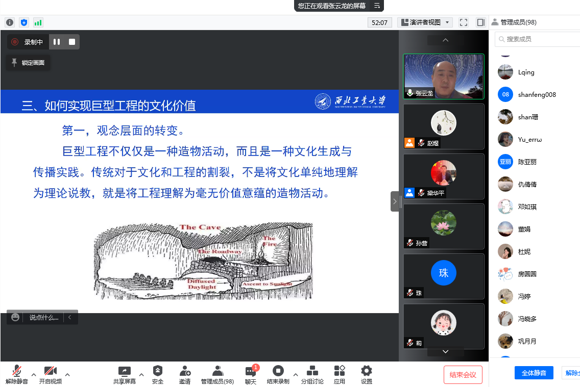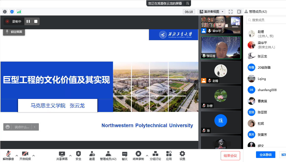 327日,成人游戏 邀请西北工业大学成人游戏 副院长张云龙教授,在线上腾讯会议平台为学院全体师生做了题为“巨型工程的文化价值及其实现”的学术讲座,此次为成人游戏 “精彩学术观”系列学术讲座第十五讲。讲座由副院长梁华平主持,学院全体师生一百余人参加了此次学术活动。