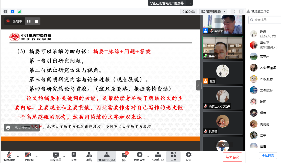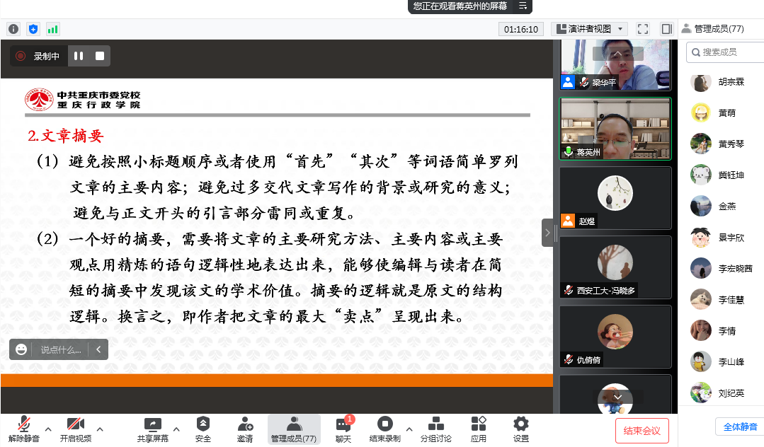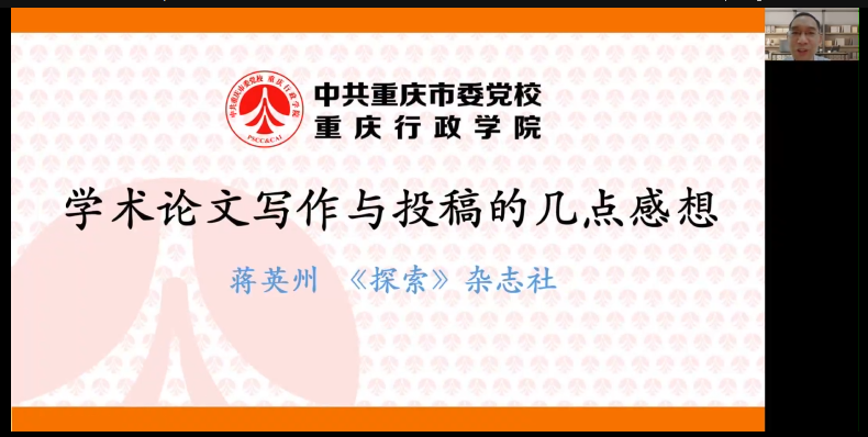 6月22日,成人游戏 邀请中共重庆市委党校《探索》杂志编辑部蒋英州教授在线上腾讯会议平台为学院全体师生做了题为“学术论文写作与投稿的几点感想”的学术讲座,此次为成人游戏 “精彩学术观”系列学术讲座第十六讲。讲座由学院副院长梁华平主持,学院全体师生参加了此次学术活动。