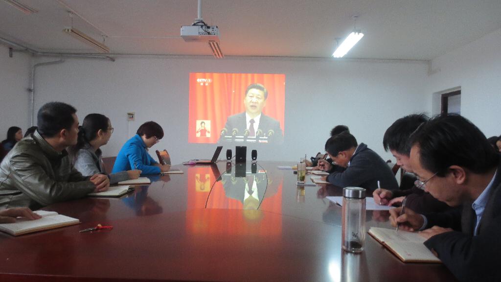 党委委员、教研部主任、支部书记和师生代表在623会议室收看十九大开幕式,认真学习习近平总书记重要讲话精神。