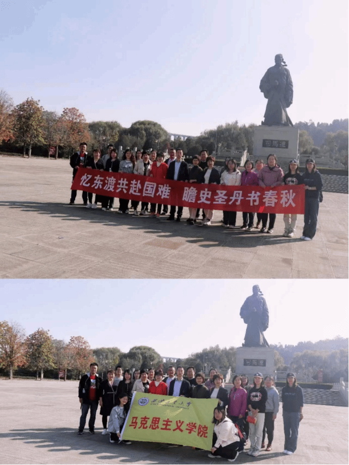 为贯彻落实党的二十大精神,积极落实“学院活力提升年”方案,大力推进学习型党支部建设,进一步提高支部教师党员的思想政治水平和党史学习教育热情,2023年10月22日,思想道德修养与法治教研部党支部、习近平新时代中国特色社会主义思想教研部党支部、毛泽东思想和中国特色社会主义理论体系概论教研部党支部联合开展“忆东渡共赴国难,瞻史圣丹书春秋”主题党日活动,三个支部的党员教师前往红色实践教学基地与中华优秀传统文化教育基地韩城八路军东渡黄河出师抗日纪念园以及司马迁祠进行了参观学习。