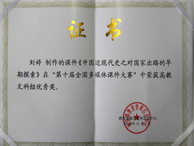 思政部刘婷老师的《中国近现代史纲要之对国家出路的早期探索》多媒体课件,喜获优秀奖。