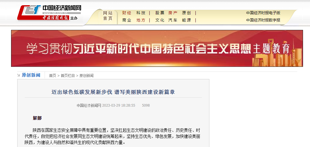 2020级研究生解娜撰写的论文《迈出绿色低碳发展新步伐 谱写美丽陕西建设新篇章》于2023年3月29日在《中国经济时报》理论版发表。该报纸是由国务院发展研究中心主办,主要探讨国民经济和社会发展中的全局性、综合性、战略性和长期性问题,通过刊载权威专家的理论研究与实践探索成果,分析当前经济社会的重点、热点、难点问题,向国务院即中央政府提供决策建议。