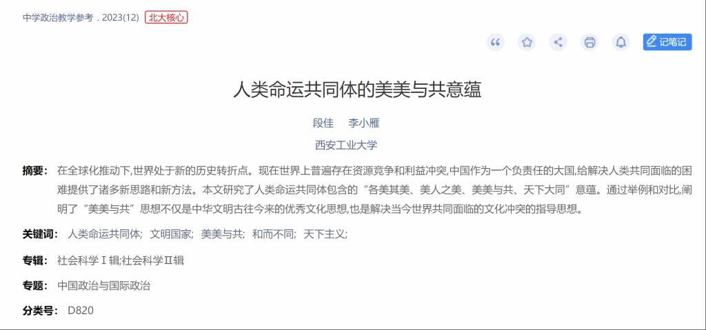 2020级硕士生陈璐、段佳的论文相继在《中学政治教学参考》发表。该期刊是由教育部主管、陕西师范大学主办、为基础教育服务、面向国内外公开发行的教学类高水平学术期刊。主要栏目包括前沿视点、课堂内外、成长空间、学术品读等。