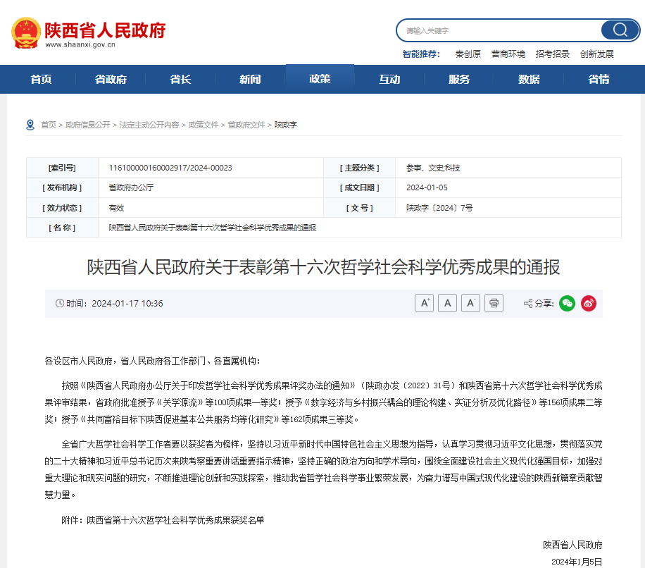 近日,陕西省人民政府发布《关于表彰第十六次哲学社会科学优秀成果的通报》(陕政字【2024】7号),校党委宣传部副部长、成人游戏