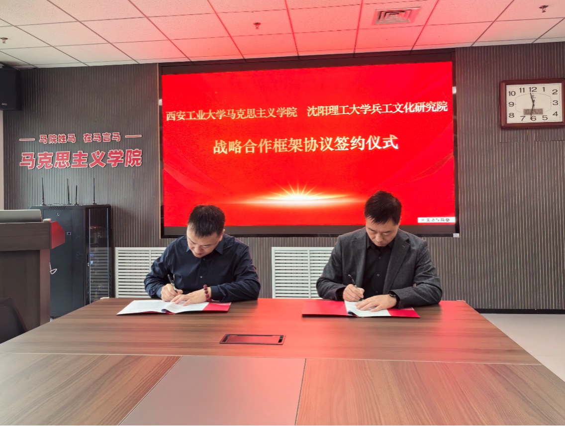 就双方战略合作签订协议。院长梁华平、副院长孟文科及中国近现代史纲要教研部主任、研究生思政公共课教研部主任等参加了签订仪式。梁华平院长对吴智院长一行的到来表示热烈欢迎,并就学院目前的发展状况进行了介绍,同时表示协议的签订将进一步加强双方的学术合作交流,促进彼此科研水平的提升。吴智院长介绍了沈阳理工大学兵工文化研究院的创设背景和发展特色,表示协议的签订首先是两所兵工院校两所学院的合作,希望下一步能加强“兵工七子”的战略合作。