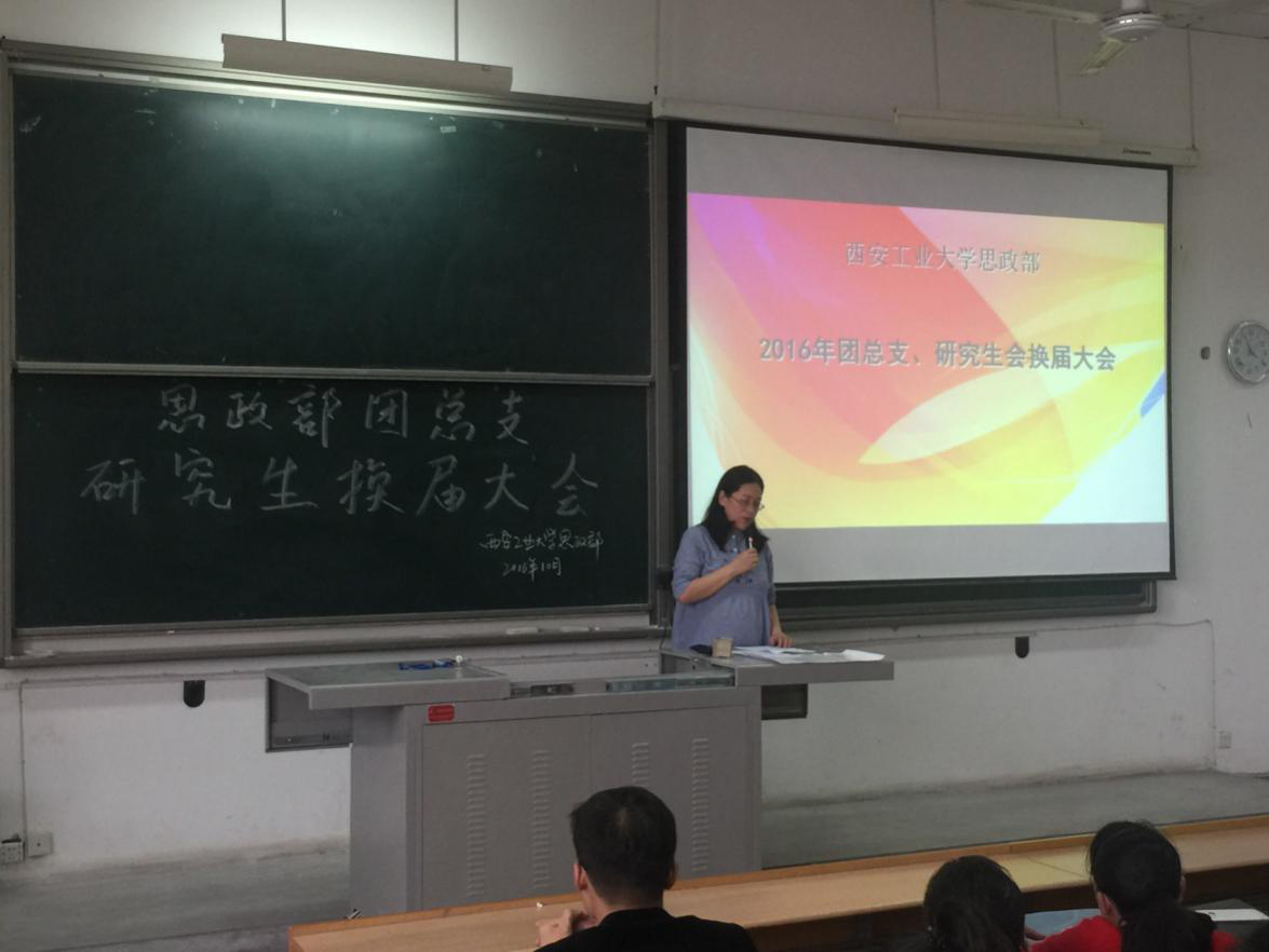 20161014日下午330分,思政部团总支、研究生换届大会在教一楼404教室召开。思政部副主任王苏喜老师、思政部研究生秘书陈泊蓉老师、思政部新一届团学干部以及思政部学生参加了会议,会议由新一届学生会主席徐雪洁主持。
