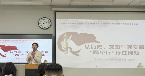 2019年标兵获得者杨丽华老师以“从历史、文本与现实看‘两个行’行在何处”为题进行分享。杨老师首先对‘两个行’的含义进行了讲解,指出第一个行表明党对马克思主义理论的坚持守正,第二个行是党对马克思主义理论的创新发展。其次从历史文本展开,强调马克思主义是历史的选择、人民的选择。再次,从现实出发,强调中国发展过程证明马克思主义是人民的理论、是实践的理论,不仅是理论学说,也是一种现实路径。最后,期许学生加强学习习近平新时代中国特色社会主义思想。