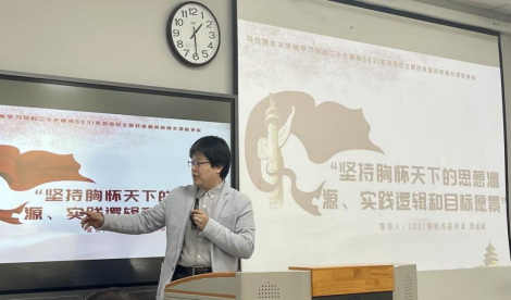2021年标兵获得者周意岷老师以“坚持胸怀天下的思想渊源、实践逻辑和目标愿景”为题进行宣讲。周老师从三方面进行展开:第一,以“己所不欲,勿施于人”“美美与共,天下大同”等思想为主阐述了胸怀天下的思想渊源、从马克思主义思想的诞生与发展讲述了胸怀天下的理论渊源、以中国共产党为视角讲述坚持胸怀天下的历史渊源。第二,从经济、政治、党际外交三个方面展开说明天下观的实践逻辑。最后,从推动人类命运共同体,共同面对全球范围内的变化和发展阐述了坚持胸怀天下的终极目标。