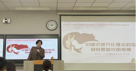 2020年标兵获得者陈泊蓉老师以“中国式现代化提出的深刻背景和光明前景”为题进行分享。陈老师首先与同学们进行互动,明确了中国式现代化的含义,表明中国式现代化是中国共产党领导的社会主义现代化,是有中国特色的现代化,是中国共产党和人民长期探索的现代化。紧接着从中华民族发展史的视角阐释了中国式现代化提出的深刻背景,分析了中国式现代化的主要内容和五大基本特征,最后,从高质量发展、“并联式”的发展过程、社会主义现代化强国“五位一体”总体布局等三个方面讲述了中国式现代化的光明前景。