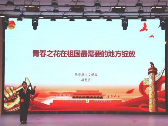 2021级研究生团支部副书记巩月月在以“青春之花在祖国最需要的地方绽放”为主题参赛,她讲出了新时代青年的心声:“年轻一代要继承和发扬吃苦耐劳、自力更生、艰苦奋斗的精神,摒弃骄娇二气,像我们的父辈一样把青春热血镌刻在历史的丰碑上。”“到祖国最需要的地方去,是伟大时代之需,是青年成长之要,是优良传统之继。奔赴光荣与梦想的远征,新时代青年更须在青春的赛道上奋力奔跑,用青春的能动力和创造力激荡起民族复兴的澎湃春潮,用青春的智慧和汗水打拼出一个更加美好的中国!”