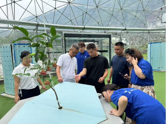 7月12日,实践队抵达此次调研的核心站点——镇安县回龙镇梓桥沟农业科技园。刚进入园区,恒温气雾大棚内的现代化种植方式——无土栽培景观便吸引了队员们的目光:圣女果、哈密瓜等果蔬在立体种植架上错落生长,雾化营养液顺着管道精准送达根系,颠覆了传统农耕的土壤依赖模式,实现了土栽培质效双提升。“通过中央智能控制,可以调节整个园区内的植物通风系统、除菌系统和营养输送系统等。采用智能的控制系统能让产量提升7倍,立体的种植方式则能够使土地利用率增加5-7倍。”园区技术人员的讲解让队员们深刻感受到科技对农业生产力的重塑之力。
