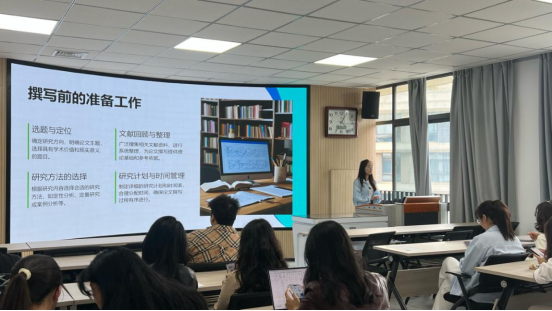 在学术分享环节,冯倩茹从学生视角详细介绍了论文写作的全过程,涵盖选题立意、前期准备、结构逻辑、语言表达及投稿规范等关键环节。她指出,选题应结合个人兴趣与学术热点,兼顾可行性与创新价值;在前期准备中,需广泛搜集文献、选择恰当研究方法、合理规划时间,并注重论文结构的严谨性与逻辑性。她特别强调,学术语言应力求准确、简洁,成稿后需反复打磨,并严格遵循投稿格式要求。此外,她还介绍了三种正规投稿渠道,提醒同学们务必通过官方途径核实信息,精准投递,并根据目标期刊要求调整格式。